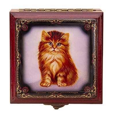 Великолепный подарок для любителей кошек. Характерная черта - оригинальный сюжет, на крышке помещен контрастный портрет котенка на белом фоне. Внутри шкатулка отделана красным велюром.