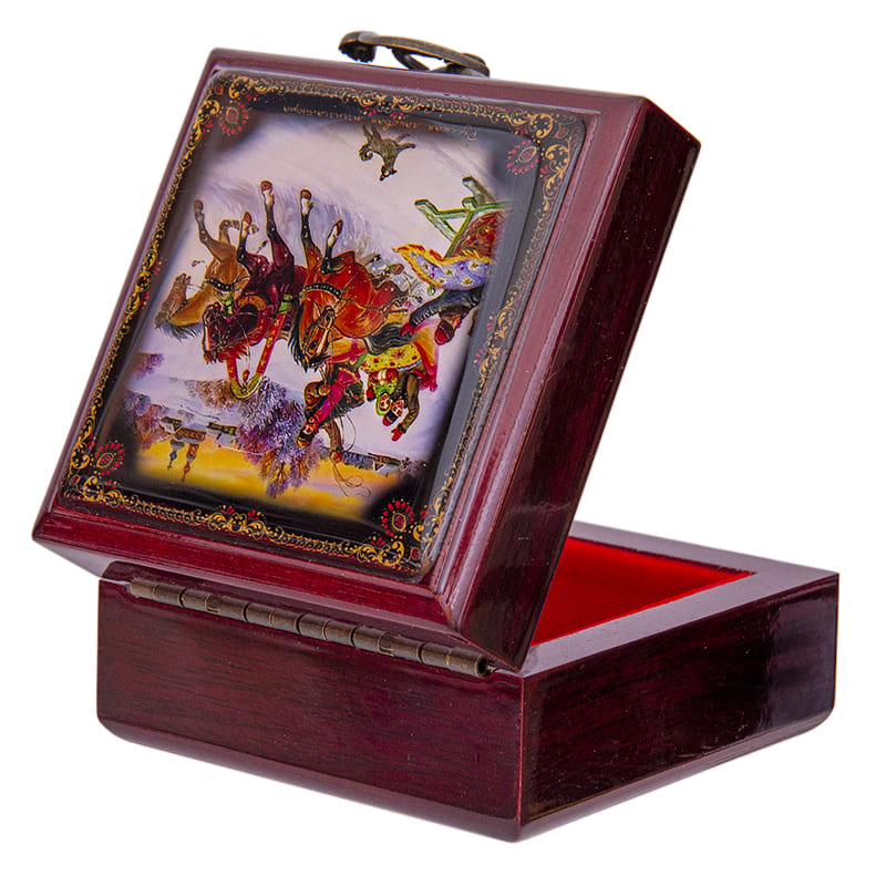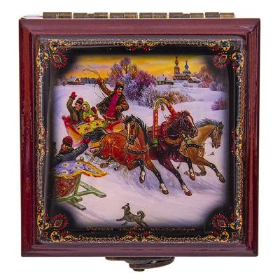 Великолепный подарок для любителей зимних праздников. Характерная черта - традиционный сюжет, на крышке помещено контрастное изображение зимней тройки. Внутри шкатулка отделана красным велюром.