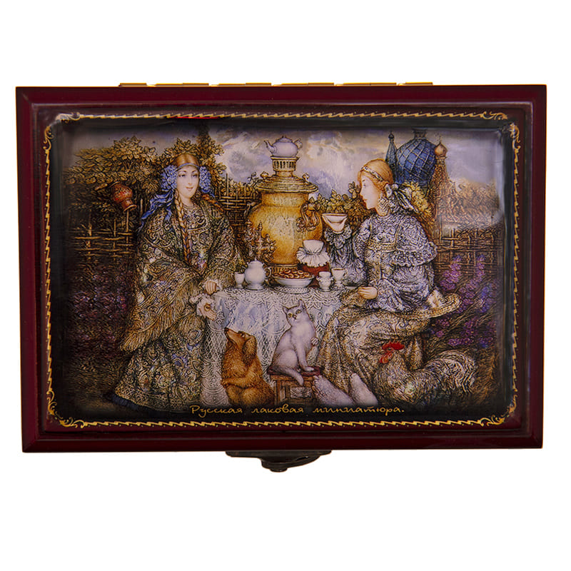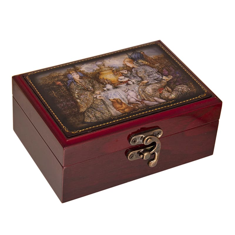 Основа шкатулки из березовой натуральной древесины. Форма традиционная, основной фон темно-коричневого оттенка, поверхность полированная.