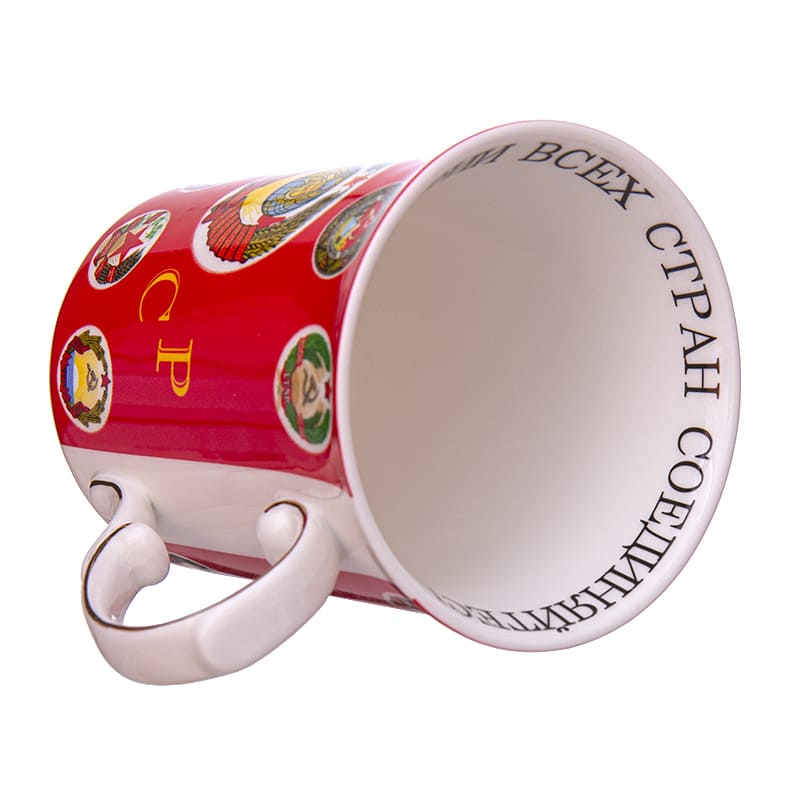 Кружка из фарфора, стандартная форма, удобная ручка. Основной фон - красный на котором изображен Герб СССР и вокруг гербы других республик эпохи Советского союза.