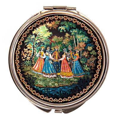 Круглое карманное зеркало двойное. Легко открывается и плотно закрывается. Корпус металлический. На поверхности - цветная миниатюра в стиле Палех, на поляне изображен хоровод из девушек в русских народных костюмах.