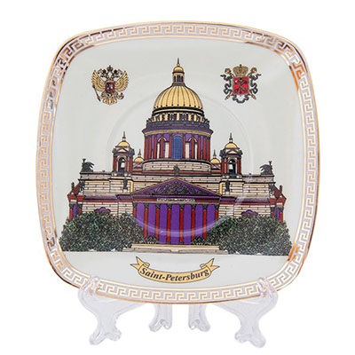 Красочная тарелка из фарфора. В центре изображен главный собор Санкт-Петербурга - Исаакиевский или собор преподобного Исаакия Далмтского. По краям узор и изображение герба Санкт-Петербурга.