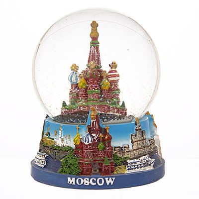 Большой снежный шар из стекла, внутри стилизованный Храм из полистоуна. По краю рельефное изображение достопримечательностей Москвы. При встряхивании, вверх взмывают хлопья, напоминающие снег. Ассоциации: зимняя Москва, русская зима, новогодние гулянья, эффектная архитектура столицы.