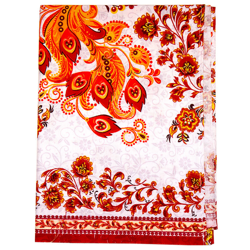 Скатерть недорогая, качественная и универсальная. Дизайн разработан российскими художниками. В комплекте будут хорошо смотреться деревянная посуда, хохломской поднос, фарфоровые изделия.