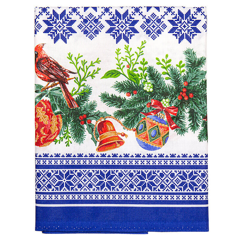 Красивая скатерть из льна. Основной фон белого цвета, синий, контрастный узор в форме геометрических элементов. По краю - орнамент из еловых веток, шишек и больших бантов. Рядом изображены зимние птички кардинал. Дизайн очень праздничный, новогодний.
