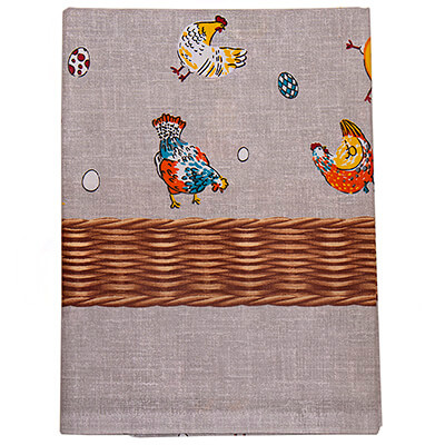 Крашение прочное, яркое. Ткань хорошо стирается, легко сохнет. На ощупь материал мягкий, плотный. Курочки и яйца символизируют плодородие, изобилие и новую жизнь.