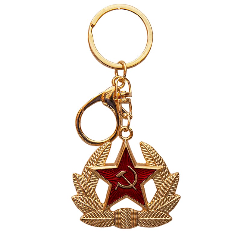 Оригинальный брелок подвеска в форме красной пятиконечной звезды с серпом и молотом в центре, обрамление - лавровые ветви как символ победы. Металл золотого цвета.