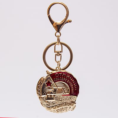 Оригинальный брелок для ключей с мощным карабином и кольцом. Подвеска сделана в форме стилизованного ордена, на котором изображено красное знамя, танк, пятиконечная звезда и надпись “Отличник соцсоревнования”.