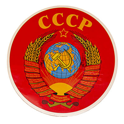 Красная большая наклейка, в центре изображение герба СССР. Вверху надпись “СССР”.
