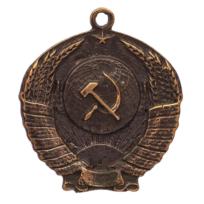 Литая подвеска в форме герба СССР, отлита из латуни, поверхность патинированная с эффектом старения. Смотрится как антикварная подвеска.