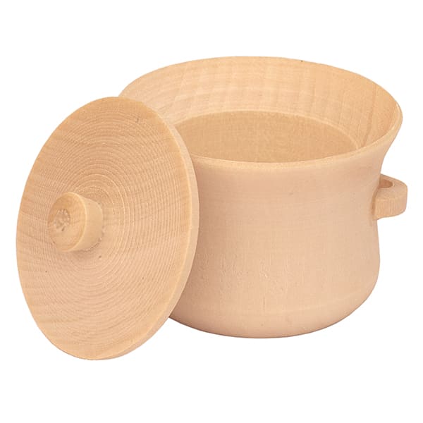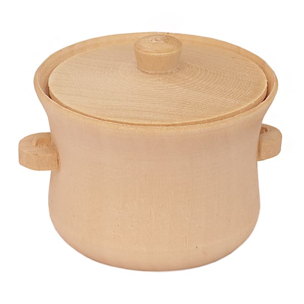 Миниатюрная кастрюля из дерева. Крышка снимается, есть миниатюрные ручки. Форма выточена очень аккуратно и четко. Это настоящая игрушечная посуда. Ее можно расписать или украсить в технике декупаж. Деревянная поверхность ровная, хорошо отшлифована. Внутри поверхность тоже выровнена.