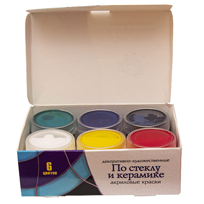 Набор красок, водостойкие, в комплекте 6 цветов - белый, красный, желтый. синий, зеленый, черный. Краски абсолютно безопасные, но не рекомендуется наносить их на внутренние части посуды. Перед нанесением краски, поверхность заготовки нужно промыть с мылом и просушить. Время схватывания 30 минут. Краски не требуют обжига.