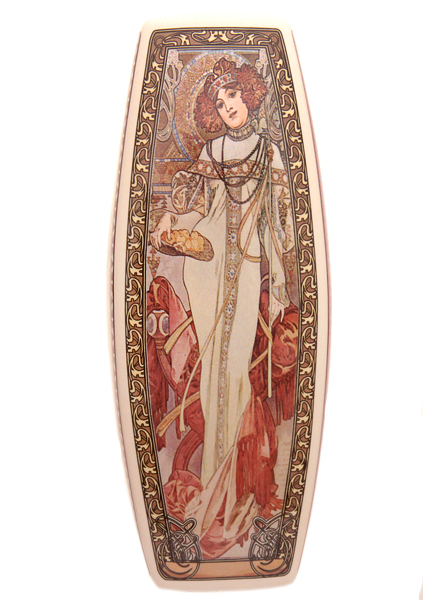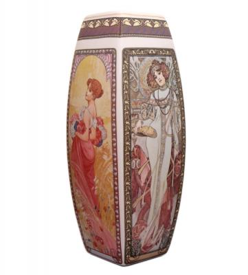 Керамическая ваза с четырьмя сторонами. Изображения в приглушенных тонах. На каждой стороне изображение одной из картин Альфонса Мухи из серии "Четыре времени года".