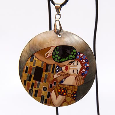 Подвеска круглой формы из натурального перламутра. На поверхности фрагмент с картины Густава Климта "Поцелуй". Поверхность покрыта лаком, есть подпись художника.