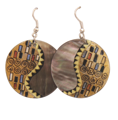 Подвеска круглой формы и серьги из натурального перламутра. На поверхности фрагмент с картины Густава Климта "Поцелуй". Поверхность покрыта лаком, есть подпись художника.